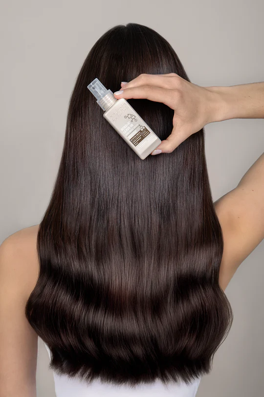 1. Dividir o cabelo húmido em 2 secções e pulverizar 2-3 vezes por secção, no comprimento e pontas.